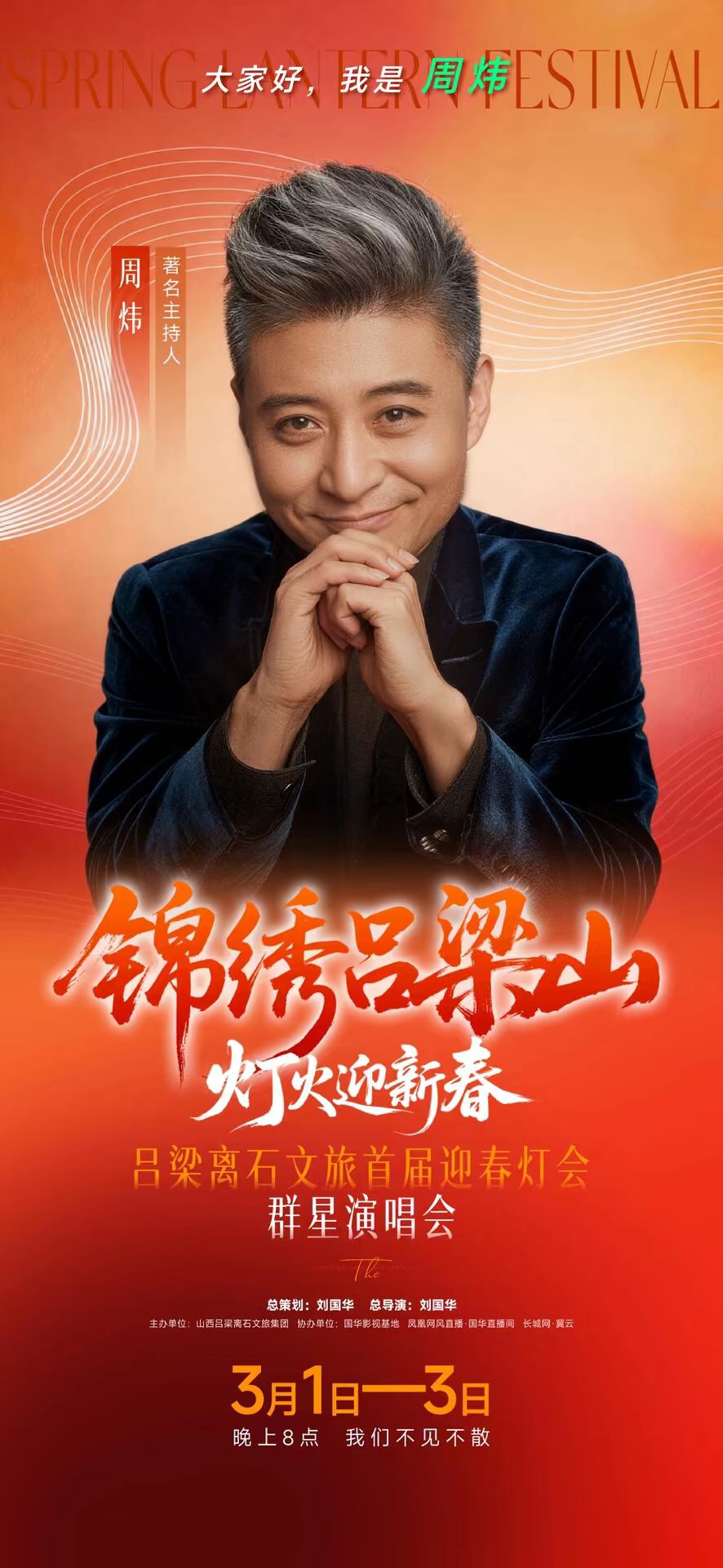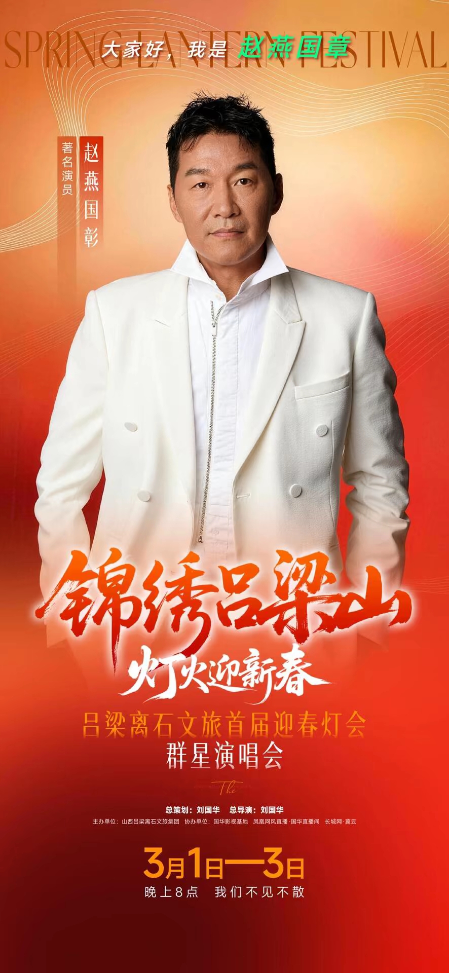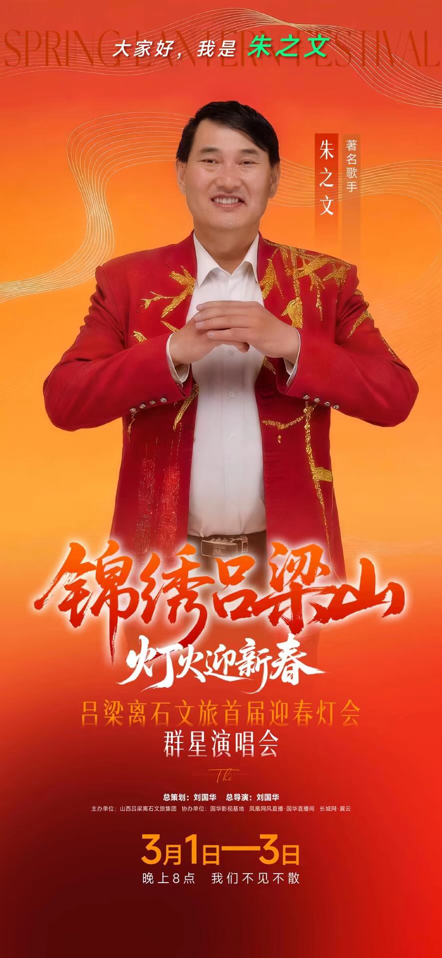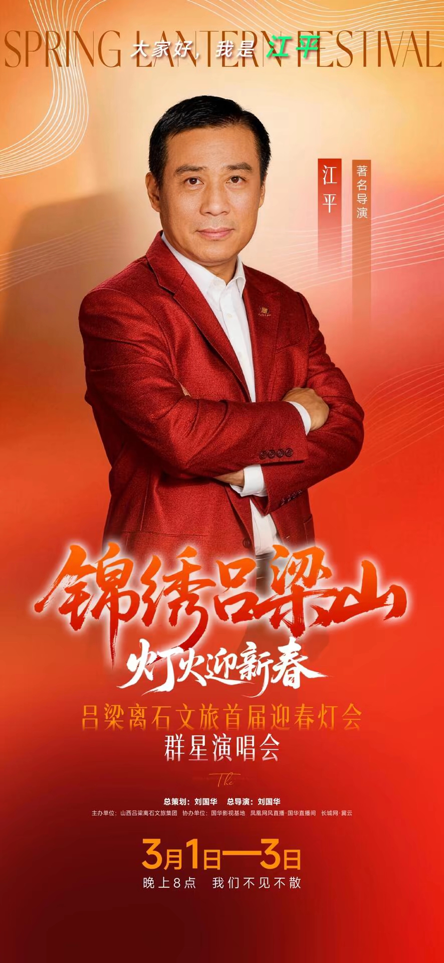本次演唱会由著名导演刘国华担任总策划、总导演,特邀著名主持人江平、著名歌唱家王洁实、上官燕联袂担纲主持。演出阵容星光熠熠、实力强劲:
